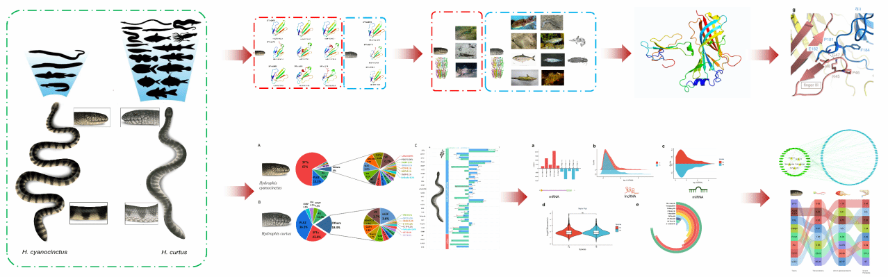 进化贯穿着所有物种的生命活动,从生命的起源到表型的多样化,再到应对疾病带来的挑战。捕食者与其猎物之间的军备竞赛促进了双方的共同进化和性状的多样性。对于毒蛇来说,毒液是连接捕食者与猎物之间相互作用的关键桥梁,但毒蛇如何在不同的猎物选择下进化出不同毒液特征的分子机制,目前仍不清楚。青环海蛇与平颏海蛇作为我国的优势药用海洋生物,由同一祖先进化而来,在许多方面相似,但在物种生态适应的核心内容——捕食上,却表现出巨大的差异;是研究近缘物种在不同的猎物选择下,表型多样化如何形成的理想模型。