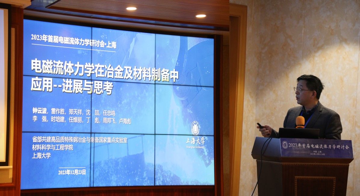 2023年12月22-24日,由中国力学学会流体力学专业委员会主办,ac米兰官网中文网站材料科学与工程学院、省部共建高品质特殊钢冶金与制备国家重点实验室承办的2023年首届电磁流体力学研讨会暨中国力学学会流体力学专委会电磁流体力学专业组工作会议在上海市宝山区维也纳酒店成功召开。ac米兰官网中文网站材料科学与工程学院执行院长钟云波教授担任本次研讨会的会议主席,ac米兰官网中文网站科研管理部李辉副部长出席开幕式并致辞。