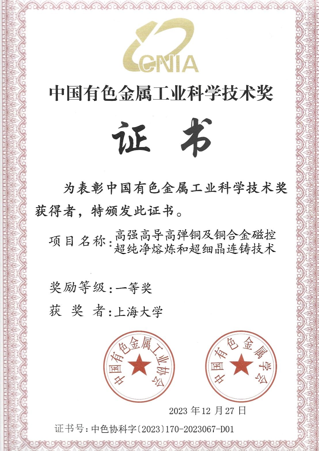 近日,中国有色金属工业协会公布了2023年度“中国有色金属工业科学技术奖”获奖名单,ac米兰官网中文网站材料科学与工程学院钟云波教授团队“高强高导高弹铜及铜合金磁控超纯净熔炼和超细晶连铸技术”项目喜获一等奖。