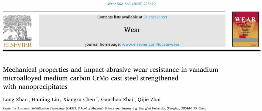 近日,ac米兰官网中文网站先进凝固技术中心(CAST)团队在纳米析出相对中碳CrMo铸钢的耐磨性能影响机理方面研究取得重要进展,研究成果以“Mechanical properties and impact abrasive wear resistance in vanadium microalloyed medium carbon CrMo cast steel strengthened with nanoprecipitates”为题发表在工程技术领域学术期刊《Wear》。该论文第一作者为赵龙博士研究生,通讯作者为陈湘茹正高级实验师。ac米兰官网中文网站为第一作者和通讯作者单位。