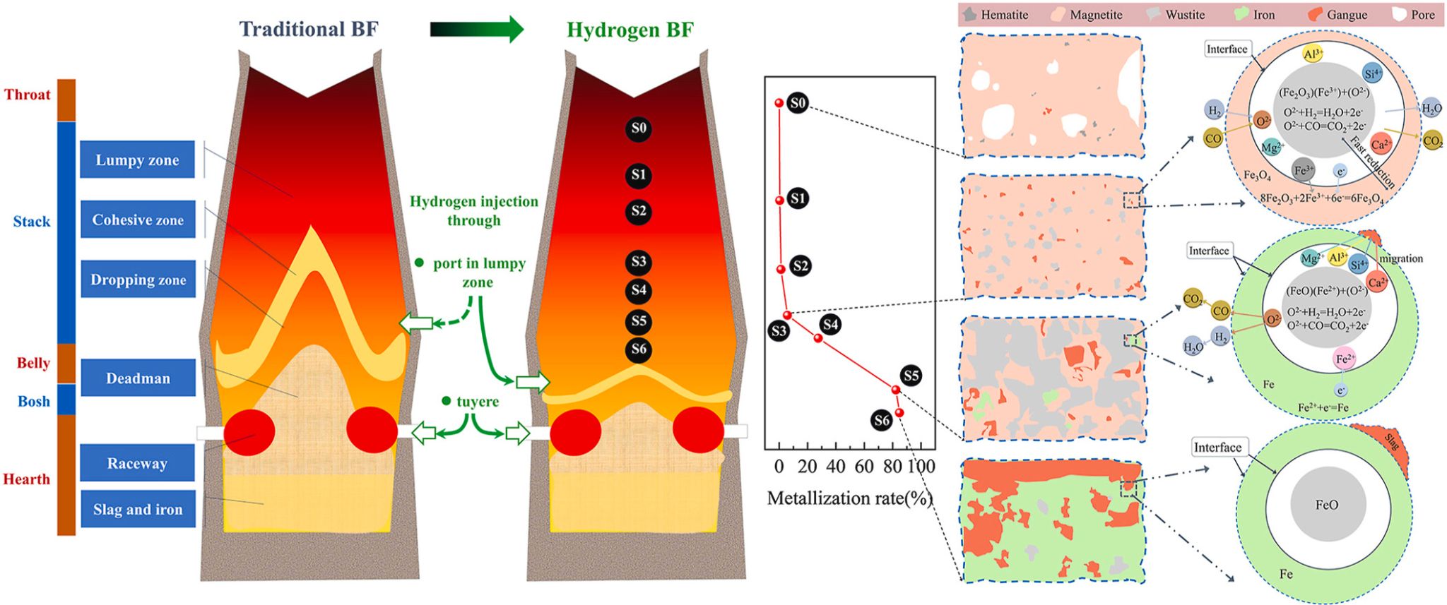 以氢代碳、氢冶金是钢铁生产低碳化的重要技术。氢冶金主要有两条路线,一条是高炉富氢冶炼技术,另一条是非高炉的氢基直接还原技术。目前,中国粗钢产量10亿吨,90%是通过传统的高炉-转炉长流程生产的,高炉炼铁是CO2排放量最大的工序,占全流程碳排放量的75%。富氢喷吹是实现高炉低碳冶炼的重要途径。弄清富氢对高炉冶炼过程的影响规律,构建高炉富氢低碳冶炼技术和工艺原型是迫待解决的关键问题。ac米兰官网中文网站氢冶金低碳技术团队提出利用冷冻-解剖富氢高炉的方法来揭示氢对高炉黑箱内反应过程的作用机理。