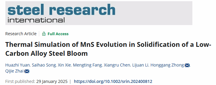 ac米兰官网中文网站先进凝固技术中心(简称CAST)团队利用连铸坯枝晶生长热模拟技术研究了不同连铸节点MnS的析出长大规律,研究成果以 “Thermal simulation of MnS evolution in solidification of a low-carbon alloy steel bloom”为题发表在冶金领域经典学术期刊《Steel research international》。该论文第一作者为袁华志博士研究生,通讯作者为翟启杰教授和仲红刚副研究员。
