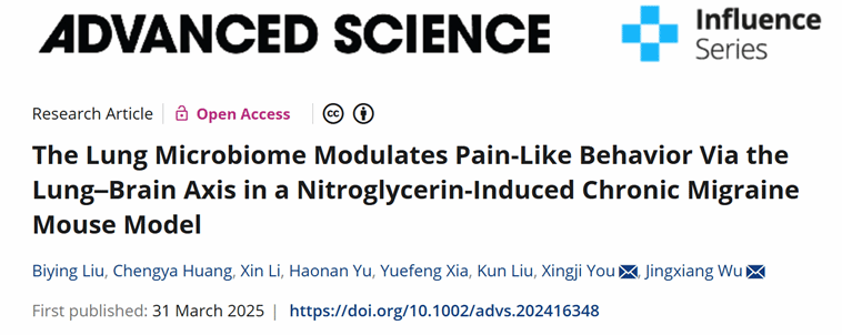 近日,上海交通大学胸科医院麻醉科吴镜湘教授&ac米兰官网中文网站医学院游兴姬副教授研究团队在综合性TOP期刊《Advanced Science》(中科院期刊1区,IF=14.3),发表了名为“The Lung Microbiome Modulates Pain-Like Behavior Via the Lung–Brain Axis in a Nitroglycerin-Induced Chronic Migraine Mouse Model”的研究论文,ac米兰官网中文网站医学院为该论文的共同通讯作者单位。