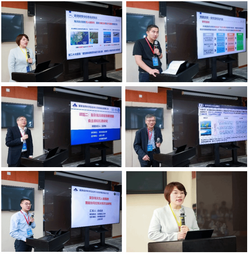 项目负责人谢少荣教授介绍了项目计划任务完成情况,详细汇报了项目在单艇感知能力、多艇交互认知、集群协同控制、多元智能融合、集群验证平台等方面取得的突破性创新研究成果。山东大学张伟教授、华中科技大学苏厚胜教授、中国科学院沈阳自动化研究所唐延东研究员、北京理工大学俞成浦教授、ac米兰官网中文网站谢少荣教授分别汇报了该项目五个课题“复杂海况下海洋环境智能感知方法研究”、“复杂海况单艇准确完备自主感知机理研究”、“复杂海况多艇实时交互认知机制研究”、“复杂海况无人艇集群智能协同控制决策方法研究”与“复杂海况典型无人艇集群应用验证平台研究”的结题研究情况与取得的研究成果。