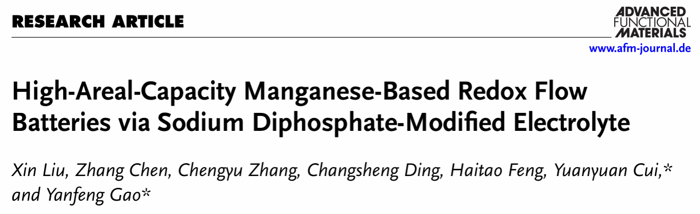 近日,ac米兰官网中文网站材料科学与工程学院高彦峰教授团队与中国科学院青海盐湖研究所合作在高面积容量锰基液流电池的研究中取得了重要进展,研究成果以“High-Areal-Capacity Manganese-Based Redox Flow Batteries via Sodium Diphosphate-Modified Electrolyte”为题发表在材料科学研究的顶刊《Advanced Functional Materials》(影响因子18.5)。材料学院博士生刘鑫为论文第一作者,高彦峰教授、崔苑苑副教授为论文的通讯作者,中国科学院青海盐湖研究所冯海涛研究员为论文合作作者。