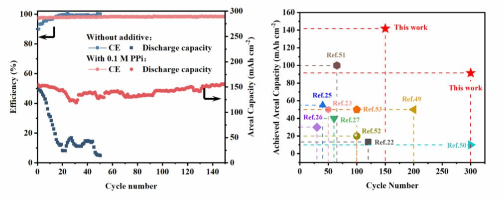 通过MnO2的结构工程,本研究成功抑制了电极上的MnO2沉积,电池能够达到91.5 mAh cm-2(300次循环和99.7%库伦效率)和141.8mAh cm-2(150次循环和98.2%库伦效率,最高报道值)的面积容量,相比无添加剂的电解液提高了10倍(图3)。本研究提出了一种新颖的低成本电解液配体策略,有效提高Mn-RFBs电池的面积容量,并具有优异的循环稳定性。这一策略同样可以扩展到其它Mn-RFBs和沉积基电池系统,实现高面积容量的应用。