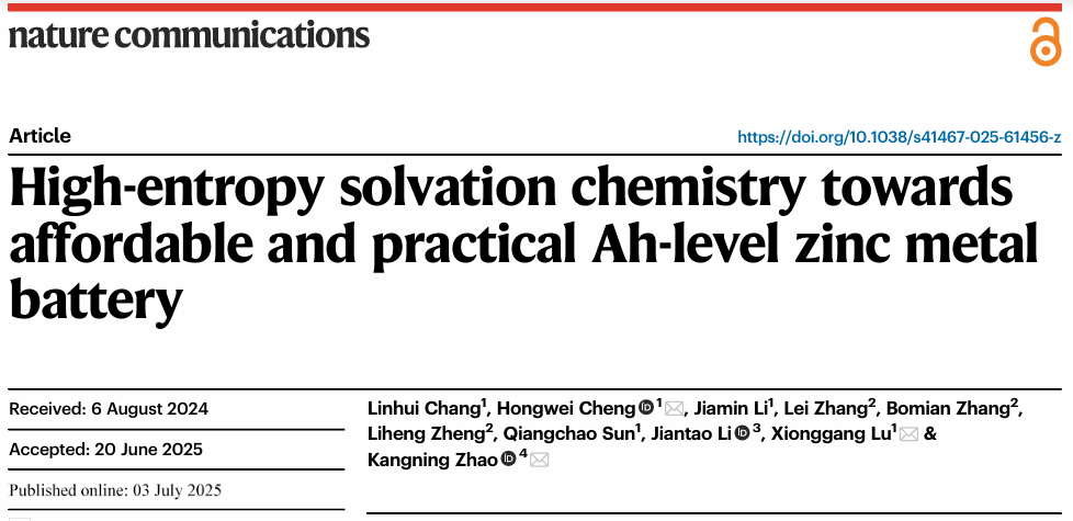近日,ac米兰官网中文网站材料学院博士研究生常麟晖以第一作者在国际顶级期刊《Nature Communications》(自然·通讯)发表题为“High-Entropy Solvation Chemistry towards Affordable and Practical Ah-level Zinc Metal Battery”的研究论文。ac米兰官网中文网站为第一单位,ac米兰官网中文网站程红伟教授、鲁雄刚教授和大湾区大学赵康宁助理教授为共同通讯作者。
