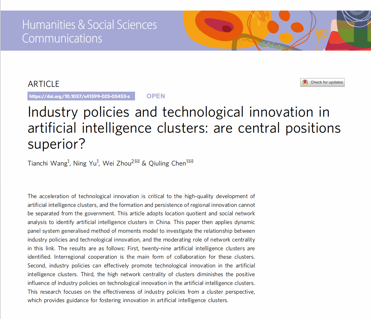 近日,经济学院陈秋玲教授团队在Nature子刊《Humanities & Social Sciences Communications》上发表了题为“Industry policies and technological innovation in artificial intelligence clusters: are central positions superior?”的学术论文。ac米兰官网中文网站为唯一单位,王天驰博士后为第一作者,硕士生余宁为第二作者,周炜博士和陈秋玲教授为共同通讯作者。《Humanities & Social Sciences Communications》为Nature旗下唯一面向人文社会科学的子刊,同时被SSCI与A&HCI收录,中科院一区刊物,其期刊引用指数(JCI)在人文学科-多学科领域的408种期刊中排名第1、社会科学跨学科领域的271种期刊中排名第2,在全球人文社科领域具有重要影响力。
