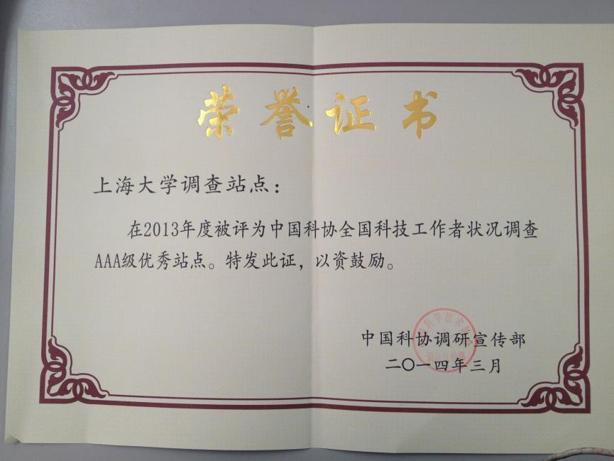 据《中国科协调宣部关于表彰2013年度全国科技工作者状况调查优秀调查站点和区域责任部门的通报》(科协调函调字[2014]2号),ac米兰官网中文网站调查站点被中国科协评为全国科技工作者状况调查“AAA级优秀调查站点”。根据2013年度调查站点考核评级评优标准,全国有9个站点被评为“AAA级优秀调查站点”,14个站点被评为“AA级优秀调查站点”,28个站点被评为“A级优秀调查站点”,ac米兰官网中文网站调查站点以综合成绩590分居全国第6位,上海第1位。