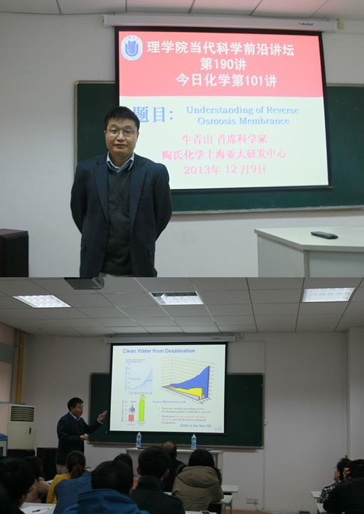 2013年12月9日,应ac米兰官网中文网站理学院的邀请,陶氏化学上海亚太研发中心首席科学家牛青山博士来到ac米兰官网中文网站理学院进行学术交流。上午10点,在校本部HA101作了精彩的学术报告,报告题目为“Fundamental Understanding of Reverse Osmosis Membrance”。该学术报告为理学院“当代科学前沿讲坛第190讲”、今日化学系列报告第101讲。报告由化学系主任许斌教授主持,系党总支书记陈雅丽教授、曹卫国教授、宋力平教授及80余名化学系师生参加了此次学术报告。