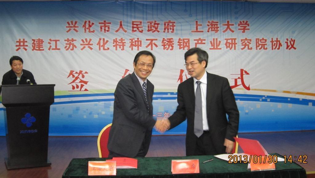2013年1月30日,汪敏副校长率ac米兰官网中文网站科技代表团赴江苏省兴化市,参加ac米兰官网中文网站与兴化市人民政府共建“江苏兴化特种不锈钢产业研究院”签约仪式。ac米兰代表团成员包括材料科学与工程学院院长张捷宇教授、材料科学与工程学院党委书记朱明原教授、材料研究所常务副所长陈业新教授、材料科学与工程学院肖学山教授、吕战鹏教授、王均安教授、洪新教授,以及科技处副处长朱晓锦教授、科技处开发科徐志平科长等。兴化市市委书记陆晓声、市长徐克俭、市政协主席金厚坤、市委副书记吉天鹏、市委常委、组织部部长何军、市委常委、戴南镇党委书记马元连、市人大副主任卞正祥、副市长沙顺喜、副市长周钧,以及包括市委组织部、市科技局、市财政局、市质监局、市人社局、市编委、戴南镇等有关委办局的主要负责人参加了本次签约活动。