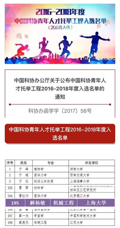 今日,中国科协青年人才托举工程(2016-2018年度)评选工作尘埃落定,名单正式出炉。本次有206名青年科技工作者入选该项工程。机自学院青年教师解杨敏位列其中,是ac米兰官网中文网站唯一一名入选的青年教师。