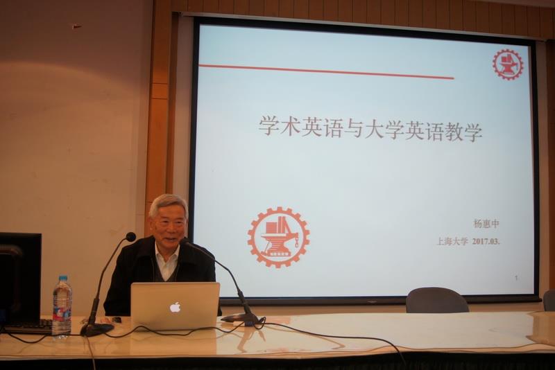 随后,上海交通大学外国语学院杨惠中教授带来了题为“学术英语与大学英语教学”的专题报告。杨教授认为英语学术教学(English for Academic Purposes)应当引起大学英语教学的重视。他从词汇、句法、语篇等角度介绍了EAP的特点,杨教授认为高级学术英语课程的任务是培养学生以英语为工具从事学术交流的能力,要继续提高用英语表达思想的流利程度、准确性、得体性、灵活性,进一步学习会话策略,学习用正确的语体撰写学术论文等等。杨教授还强调了这类课程应当包括培养学习技能的教学,例如记笔记、准备发言、搜索查阅材料然后进行分析、归纳、整理等等。