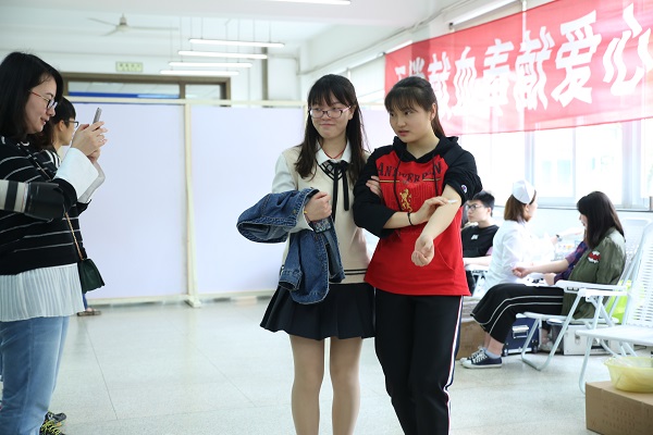 献血当天活动中,一早的大雨并未阻止同学们的浓浓热情,大家早早来到献血活动现场,自觉有序的排列队伍,经血压、心率等检查后,像军人一般纷纷挽起袖口。不少老师排在了献血队伍的最前端,生动展现珍爱生命的人道主义精神,在彩绘爱心地图的同时,他们的行动给学生们起到了良好的引领作用。一批批献血同学献完后,还不忘用言语和眼神鼓励身后待献同学,用实际行动践行着青春志愿,谱写了生命中最美的乐章。本次无偿献血活动中,涌现出了不少令人感动的场面。有的同学经过血压、心率等检查后身体不合格,丝毫不甘心;穿梭于人群中的志愿者们,更是悉心搀扶、照顾着周围同学,为他们温情地送上牛奶、巧克力、蛋糕等营养品;有的同学因身体不符合献血要求而被淘汰,但他们热情高涨,主动担当起义务志愿者,为献血的同学做好服务工作;也有的毕业班学生虽然在外面实习、或忙于毕业设计,但得知献血活动后毅然踊跃报名参加献血。