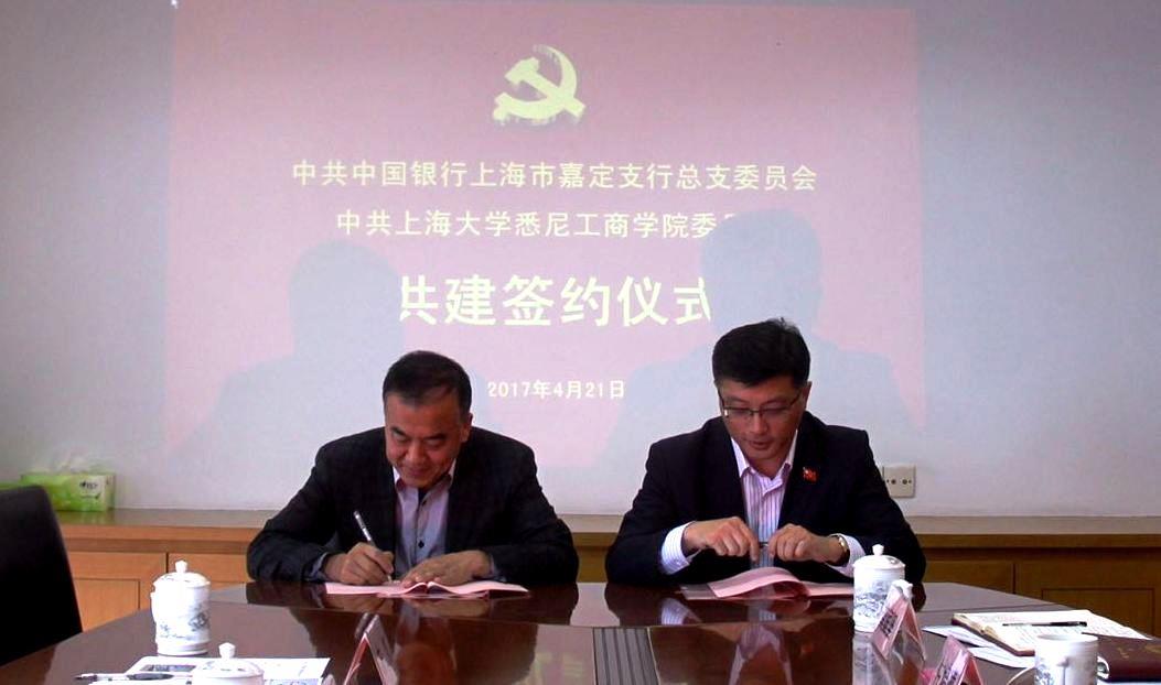 为创新基层党建工作载体,提高基层党建工作水平,按照中共上海市嘉定区委、ac米兰官网中文网站党委关于进一步发挥地区与高校优势,加强合作,促进嘉定和ac米兰官网中文网站共同发展的精神和要求,经前期沟通协商,悉尼工商学院党委与中国银行嘉定支行党总支实现党建、精神文明共建结对。4月21日上午,共建签约仪式在中行嘉定支行举行。行长兼总支书记仇一尘、副行长兼总支副书记施晓瑾等出席会议,学院党委书记李双、副书记卫静芬、副院长方慧等前往参加会议。