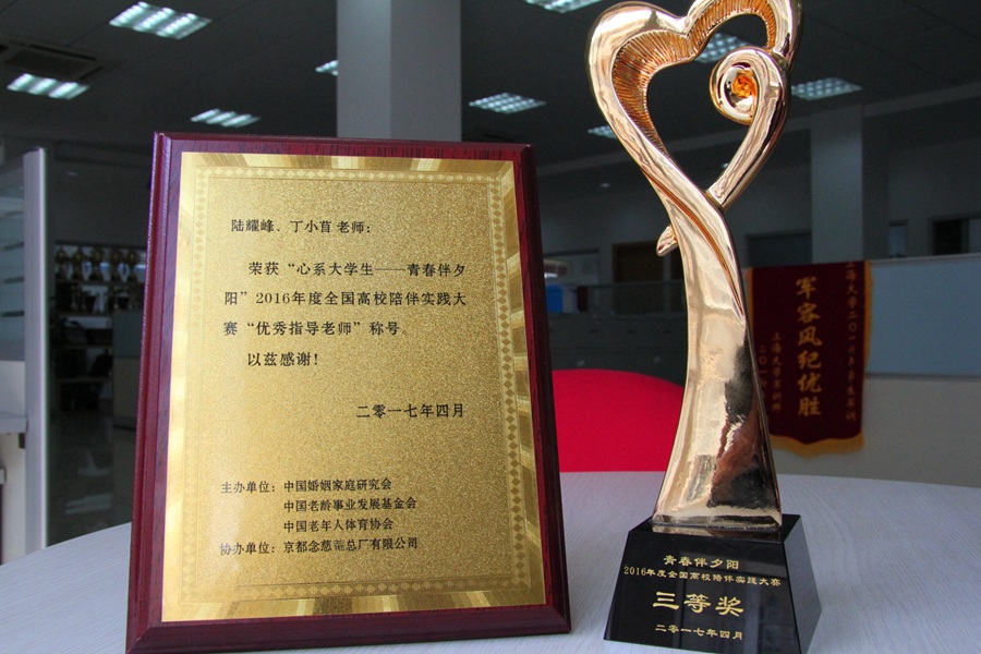 本次活动邀请了中国婚姻家庭研究会、中国青年志愿者协会、中国老龄事业发展基金会、中国健康教育中心、中国老年人体育协会、中国妇女发展基金会、心系系列活动项目办公室等单位相关领导,来自北京、天津、上海、重庆、广州、西安、南京等城市高校团委负责人、大学生志愿者代表、媒体代表以及爱心支持企业京都念慈菴总厂有限公司领导。在ac米兰官网中文网站团委的支持与指导下,社区学院辅导员马成瑶、陆耀峰参加了本次活动并上台领奖与发言。ac米兰“剪人生”公益团队的项目在前期方案赛中获得了全国三等奖,并在实践赛中与上海新途社区健康促进社合作开展的“执掌手中笔,雕篆岁月痕”孝亲敬老活动也获得了全国实践赛的三等奖,陆耀峰、丁小苜获得“优秀指导教师”称号。