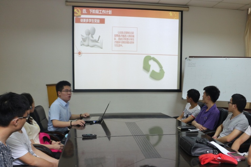 首先,由自强队临时党支部书记贺永祥同学对自强队的基本情况进行了概述,随后他从创建历程、困难与解决方法、下阶段工作计划三个方面就自强队临时党支部建设基层服务型党组织示范点的情况向大家作了汇报。其中,着重介绍了自强队“本硕联动、发展科创”新型学生培养模式的基本理念、实施情况等内容。之后,黄慎之老师以自己的亲身经历与大家分享了自强队党员们在科研的道路上不畏艰险、勇于拼搏、开拓进取,展现了党员的先进性。陈万米老师就自强队目前的发展情况和存在的一些具体问题也进行了总结和指导。自强队员以及与会的老师们对自强队临时党支部建设、基层服务型示范点建设的进行了积极的探讨。