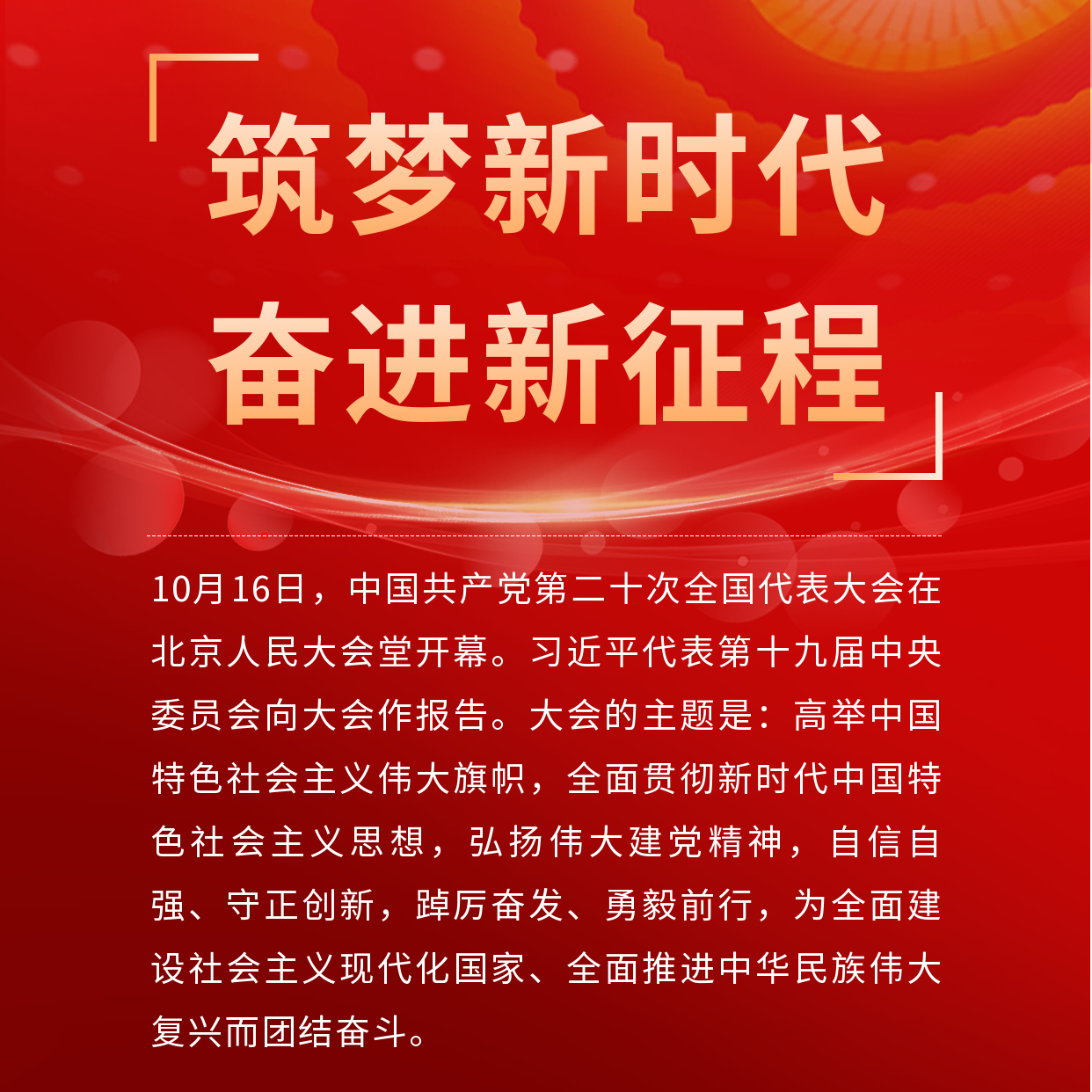 10月16日,中国共产党第二十次全国代表大会隆重召开,会议宣示了党在新征程上举什么旗、走什么路、以什么样的精神状态、朝着什么样的目标继续前进,对全面建成社会主义现代化强国两步走战略安排进行宏观展望,科学谋划未来5年乃至更长时期党和国家事业发展的目标任务和大政方针,是全党全国各族人民迈上全面建设社会主义现代化国家新征程、向第二个百年奋斗目标进军的关键时刻召开的一次十分重要的大会,也是世界人民的一场盛会。