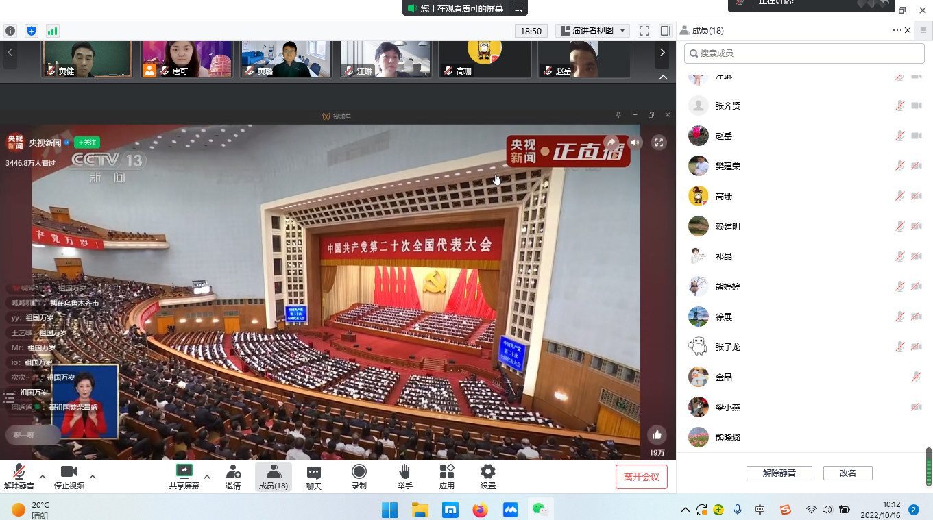 10月16日上午,中国共产党第二十次全国代表大会在北京人民大会堂开幕,习近平总书记代表第十九届中央委员会向大会作报告。大会的主题是:高举中国特色社会主义伟大旗帜,全面贯彻新时代中国特色社会主义思想,弘扬伟大建党精神,自信自强、守正创新,踔厉奋发、勇毅前行,为全面建设社会主义现代化国家、全面推进中华民族伟大复兴而团结奋斗。材料学院党委组织师生党支部共同收看,结合自身畅谈学习体会。