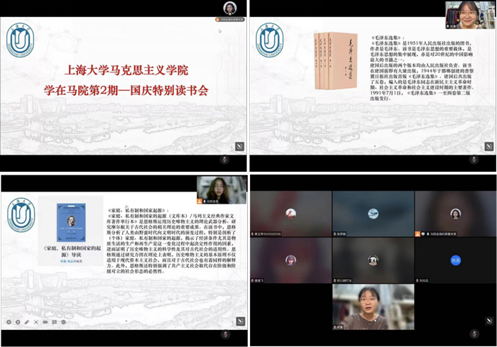 国庆期间同学们发挥专业特长在线上举办了“学在马院——国庆特别读书会”活动,同学们读原著、学原文、悟原理,畅所欲言,真诚交流,活动在轻松愉快的氛围中圆满完成。此次读书会活动让同学们从书籍中获得了力量,培养了人文情怀,提高了思想境界,同学们在浓厚的阅读氛围中坚定了为中华民族伟大复兴而读书的理想信念,进一步夯实了理论学养。
