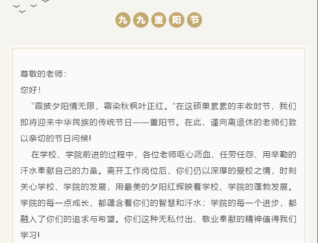 学院坚持为老教师们办实事、做好事、解难事,保障敬老补贴1:1配备到位,同时对于高龄、重病老教师,学院配备了专门慰问金。学院还给每位老教师发放了一封慰问信,感谢老教师们曾为学院发展做出的贡献,也传递了学院对老同志的关心和关怀。