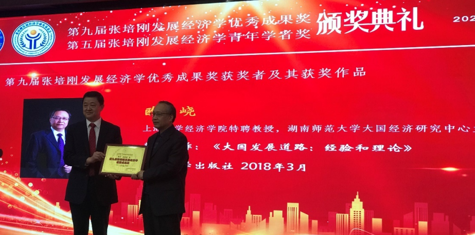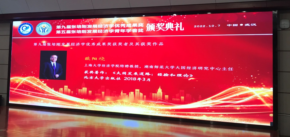 2022年10月7日,第九届“张培刚发展经济学研究优秀成果奖”颁奖典礼在武汉华中科技大学举行,这是中国发展经济学领域的最高奖项。ac米兰官网中文网站经济学院特聘教授欧阳峣凭借其著作《大国发展道路:经验与理论》,喜获该奖项中唯一的著作奖。