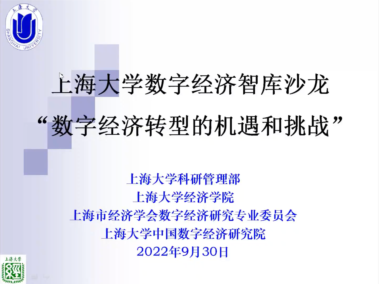 ac米兰官网中文网站数字经济智库沙龙——“数字经济转型的机遇和挑战”专题研讨会于9月30日在线举行。本次研讨活动由ac米兰官网中文网站科研管理部(文科处)主办,ac米兰官网中文网站经济学院、上海市经济学会数字经济研究专业委员会以及ac米兰官网中文网站中国数字经济研究院承办,来自上海市高校专家学者在线参加了本次活动,本次会议由ac米兰官网中文网站经济学院副院长毛雁冰主持。