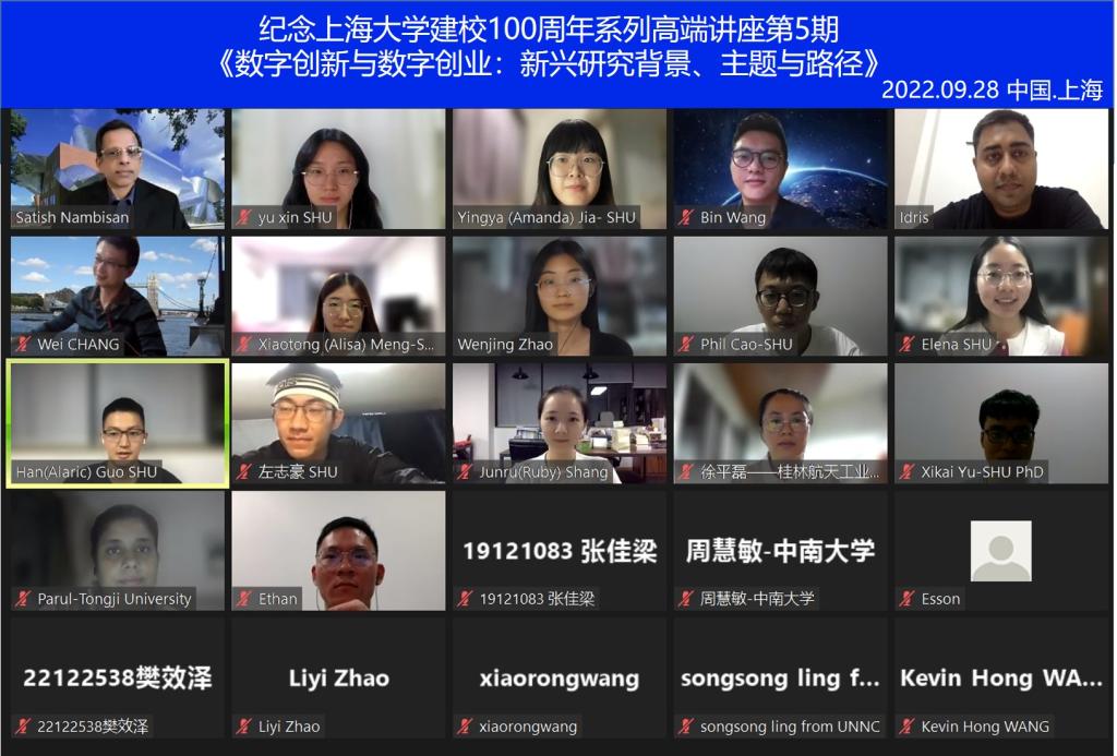 讲座尾声,ac米兰官网中文网站管理学院金晓玲教授、董学兵副教授,广东工业大学博士生盛妍艺,及ac米兰官网中文网站管理学院博士生孟晓彤、马晓书、曹港等分别围绕数字技术与气候变化、分布式创新中主体创新产出的衡量方法、全球数字化背景下创业生态系统的未来研究趋势、数字技术对创业者幸福感的影响、数字技术与创业失败学习及分析的关系、数字技术的阴暗面、及创业者数字身份的特殊性等问题与Satish Nambisan教授进行了深入探讨。本次讲座向与会者分享了新兴背景下的数字创新与数字创业的前沿研究,不仅为创新创业领域的研究学者开拓了新思路,而且加深了学者们对数字时代创新和创业的深刻理解,启发研究者不断地从新现象中探索新问题、发展新理论。讲座最后,Satish Nambisan教授与全体与会者视频合影,纪念ac米兰官网中文网站建校100周年系列高端第5期讲座顺利举办。