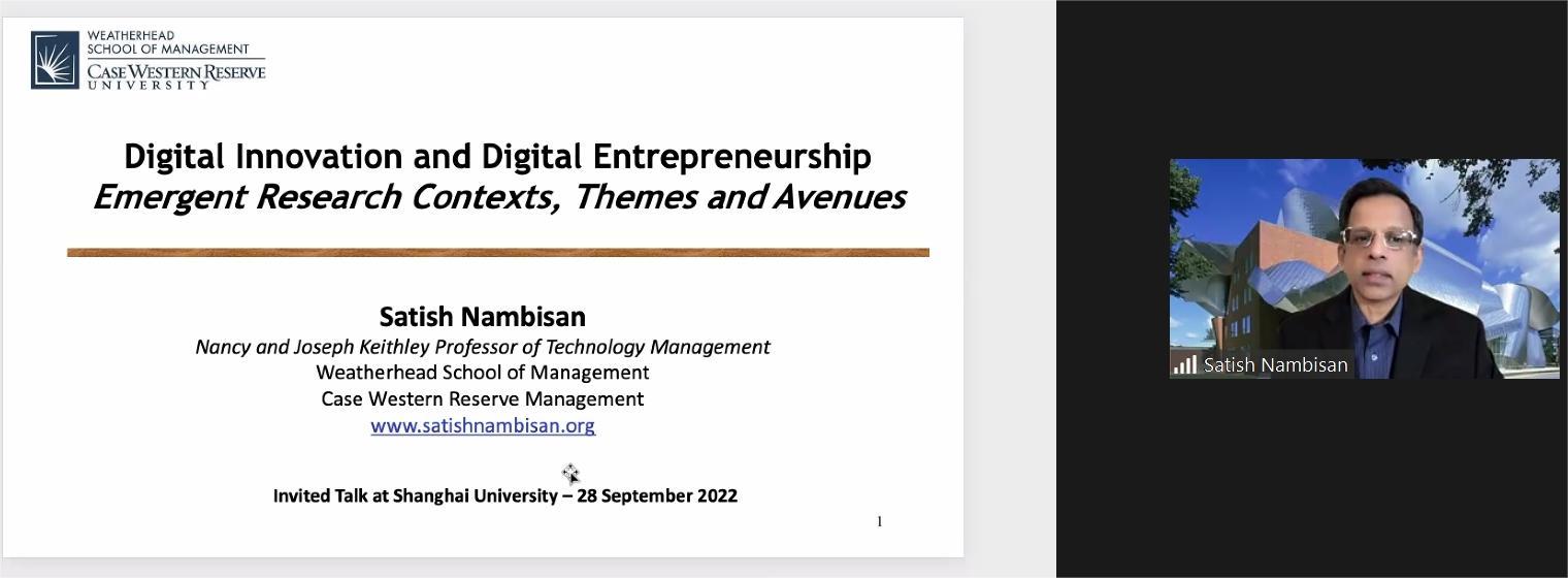 9月28日,纪念ac米兰官网中文网站建校100周年系列高端讲座第5期《数字创新与数字创业:新兴研究背景、主题与路径》在ZOOM在线会议室举行,讲座由ac米兰官网中文网站管理学院、ac米兰官网中文网站数字创新与高质量发展研究中心、上海高水平地方高校“数字创新管理与治理”重点创新团队、上海市软科学研究基地—上海企业创新与高质量发展研究中心联合主办。主讲人为来自美国凯斯西储大学魏德海管理学院(Weatherhead School of Management, Case Western Reserve University)的Satish Nambisan教授,讲座由ac米兰官网中文网站管理学院贾迎亚副教授主持。