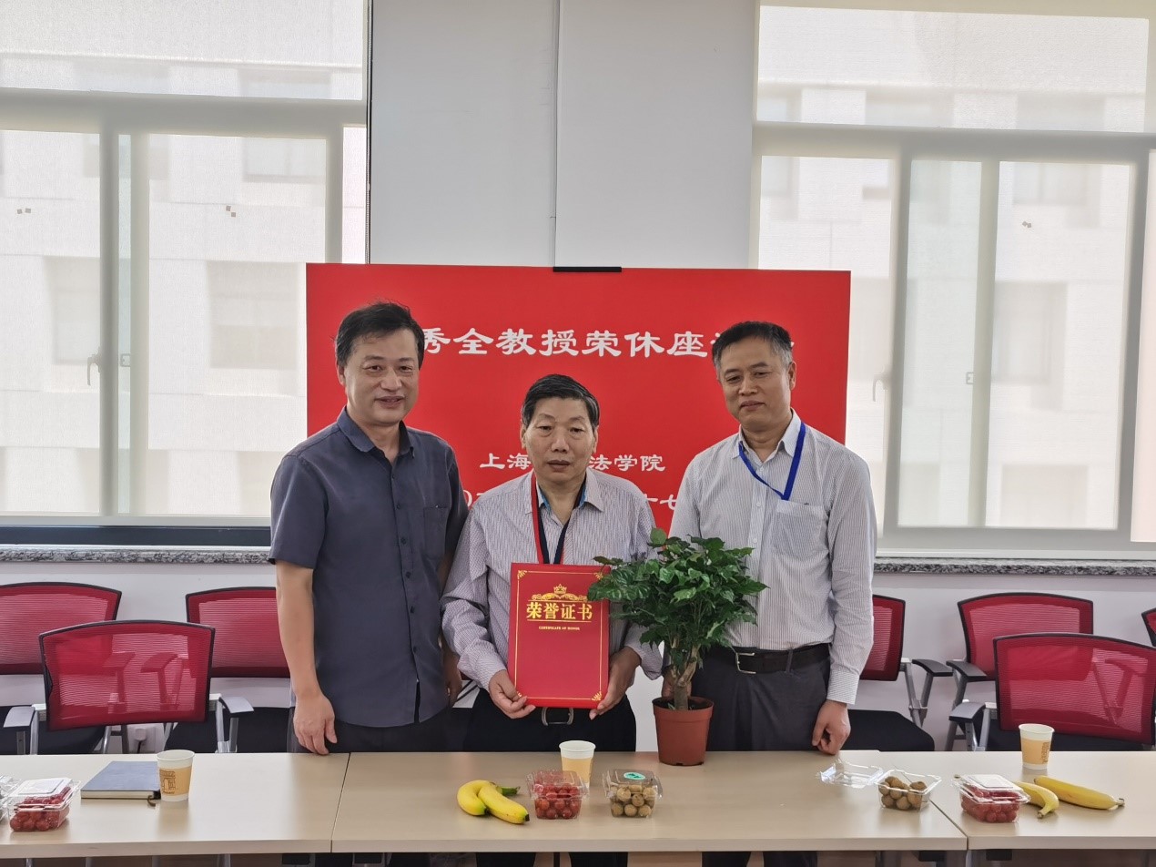 荣休仪式上,学院党委书记徐国明、院长李凤章首先为张秀全教授颁发荣休证书并献上幸福树,感谢张秀全教授为上大法学院和民商法学科的发展做出的杰出贡献,并祝愿张老师身体健康,生活幸福安康。