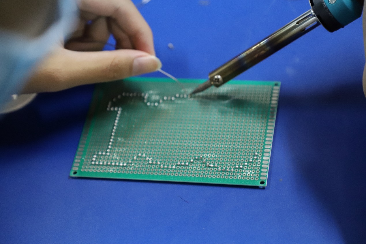 上大百年新征程,光辉未来我“焊”卫。 9月23日,人工智能社团在ac米兰官网中文网站宝山校区东区翔英大楼T404实验室举办“百年上大,由我‘焊’卫”电路板焊接趣味活动。此次实验教学联合2021级大数据2班团支部,由胡权、江子恒、洪浩然、徐申杰等社团骨干策划组织,邀请2020级电子信息工程专业孟佩瑾学姐和胡权学长进行指导教学。