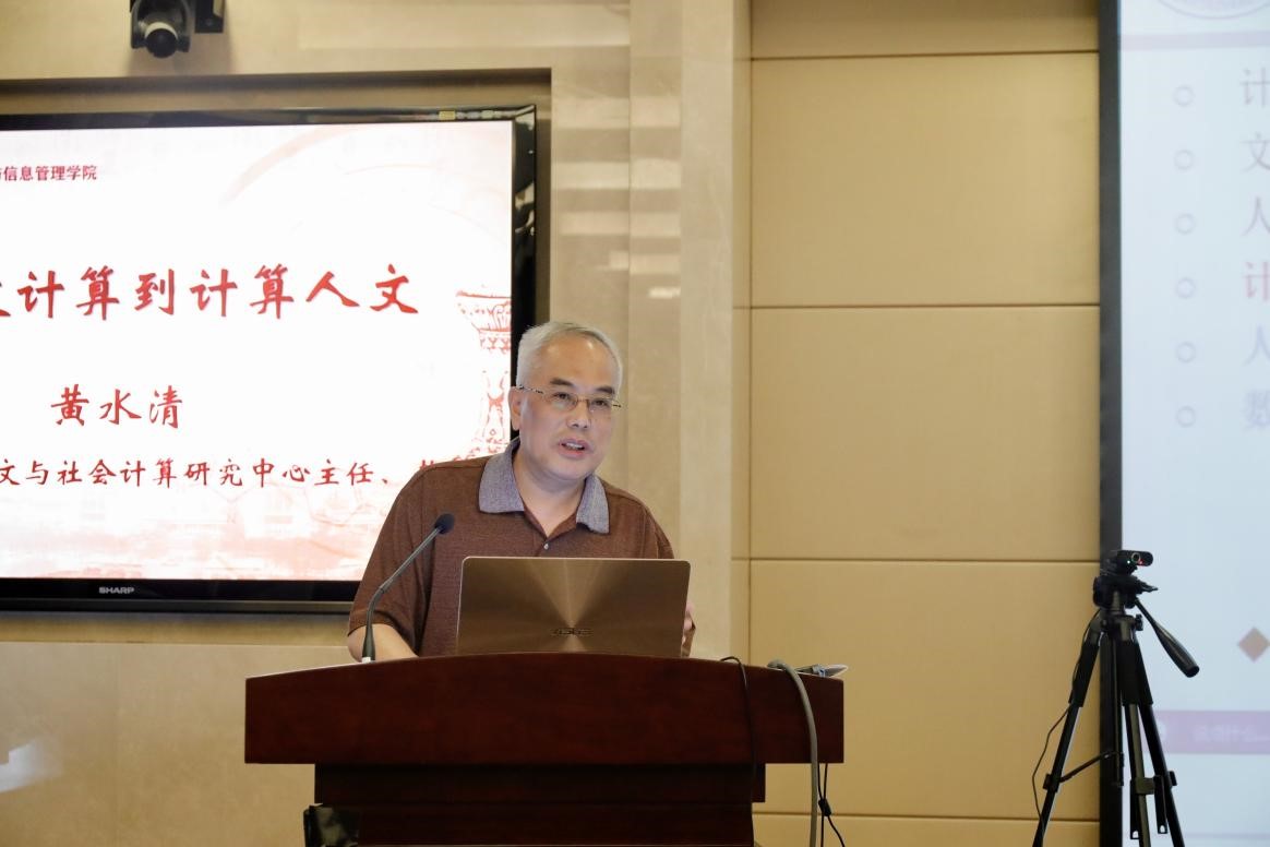 黄水清教授作了“从人文计算到计算人文”的学术报告。黄教授首先从名词的角度,对人文计算进行了分析,进而总结了四个要点,分别是“人文计算、数字人文与计算人文没有本质区别”,“人文计算、数字人文、计算人文不是进化关系”,“计算人文更能体现时代需求”,“不同名称的价值”。指出计算人文本质上是人文科学,计算人文须回答人文科学的问题,计算人文助力人文学科发展。