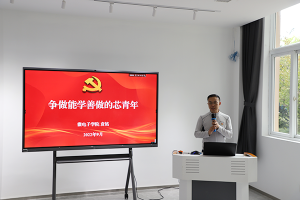 会议最后,微电子学院党委副书记、副院长袁铭老师为学生们讲专题党课。袁铭老师从自身经历讲起学习的重要性,无论专业背景如何,站在新起点,就要牢固树立终身学习的理念,立志成为文理交融的多学科复合型人才。不仅要学习专业知识,更要加强政治学习,学习政策、学好党史。为学之实,固在实履——袁铭老师提到要学以致用,在实践中砥砺才干、增长本领。最后叮嘱与会党员要学会自律、学会自信、学会自强。寄语学生党员们要厚植家国情怀,牢记校训精神,争做能学善作的芯青年。