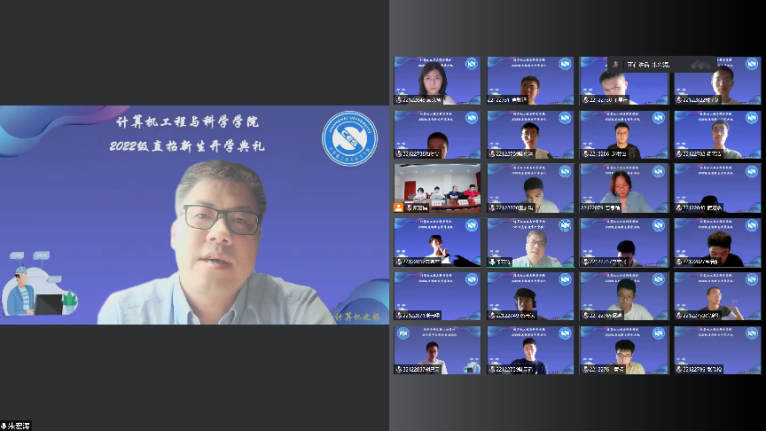 9月8日下午,计算机学院2022级新生开学典礼以腾讯会议的形式于线上举行,主会场设立于计算机学院1104会议室。学院党委书记朱宏涛老师、院长谢少荣老师、党委副书记兼副院长钱文馨老师、副院长李晓强老师、计算机科学与技术系主任邹国兵老师、智能科学与技术系主任钱权老师、网络空间安全专业教师戴佳筑老师、人工智能专业教师辛立明老师、院教务办薛丹老师以及22级辅导员秦嘉楠老师与159名新生们共同出席。