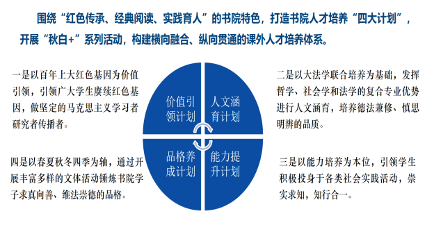 秋白书院由社会学院、法学院、马克思主义学院三个专业学院以及社区学院部分人文大类学生共同组成,涵盖社会学、社会工作、法学、知识产权、哲学、思想政治教育等六个不同专业。书院立足学科优势,旨在通过整合融通哲学、社会学和法学等学科资源,以大法学交叉学科培养为基础,构建横向融合、纵向贯通的课外人才培养体系,推出秋白书院“四大育人计划”和“秋白+”系列活动,努力培养学科视野开阔、能力素养全面、人格健全的卓越创新人才。