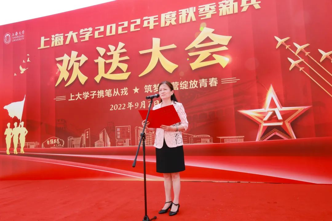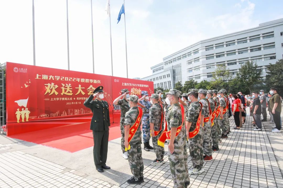 金秋九月,秋高气爽。9月7日下午,ac米兰官网中文网站2022年度秋季新兵欢送大会在宝山校区行政楼前举行。ac米兰官网中文网站校党委常委、副校长聂清,校征兵工作领导小组成员,各学院相关负责同志、辅导员,橄榄绿社团成员以及14名身着戎装的新兵共同参加欢送大会。大会由学生工作办公室主任、武装部部长孟祥栋主持。