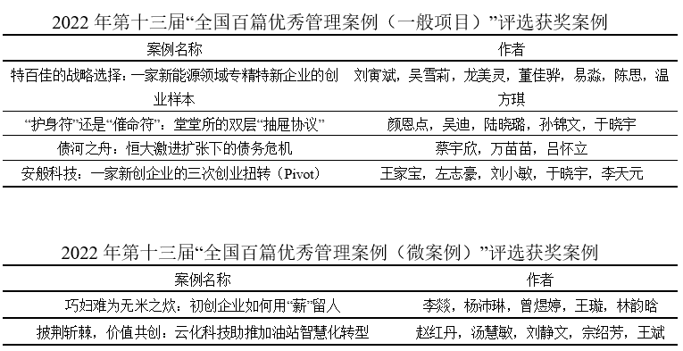 自2010年起,由全国工商管理专业学位研究生教育指导委员会主办、中国管理案例共享中心组织的“全国百篇优秀管理案例”评选活动,目前已成功举办十三届。“全国百篇优秀管理案例”是中国管理案例评选的最高奖项,被誉为全国管理案例教学界“奥斯卡”,教育部已将其列为学科评估(工商管理一级学科)的评价指标(C5项)。入选的案例质量要求与国际接轨,并与毅伟商学院案例库合作面向全球发行。其承办单位中国管理案例共享中心致力于开发中国本土原创高质量案例,推动和提高中国管理案例教学与研究水平。“全国百篇优秀管理案例”对推进管理案例在全国工商管理教育的广泛使用,起到了巨大的推进作用,并带动了其他专业学位案例的建设与发展。