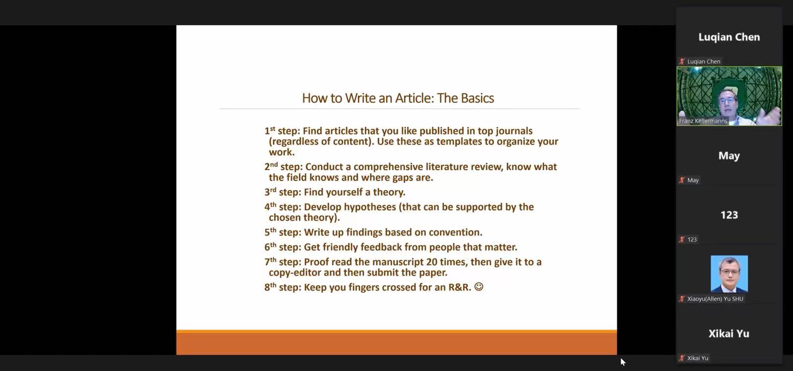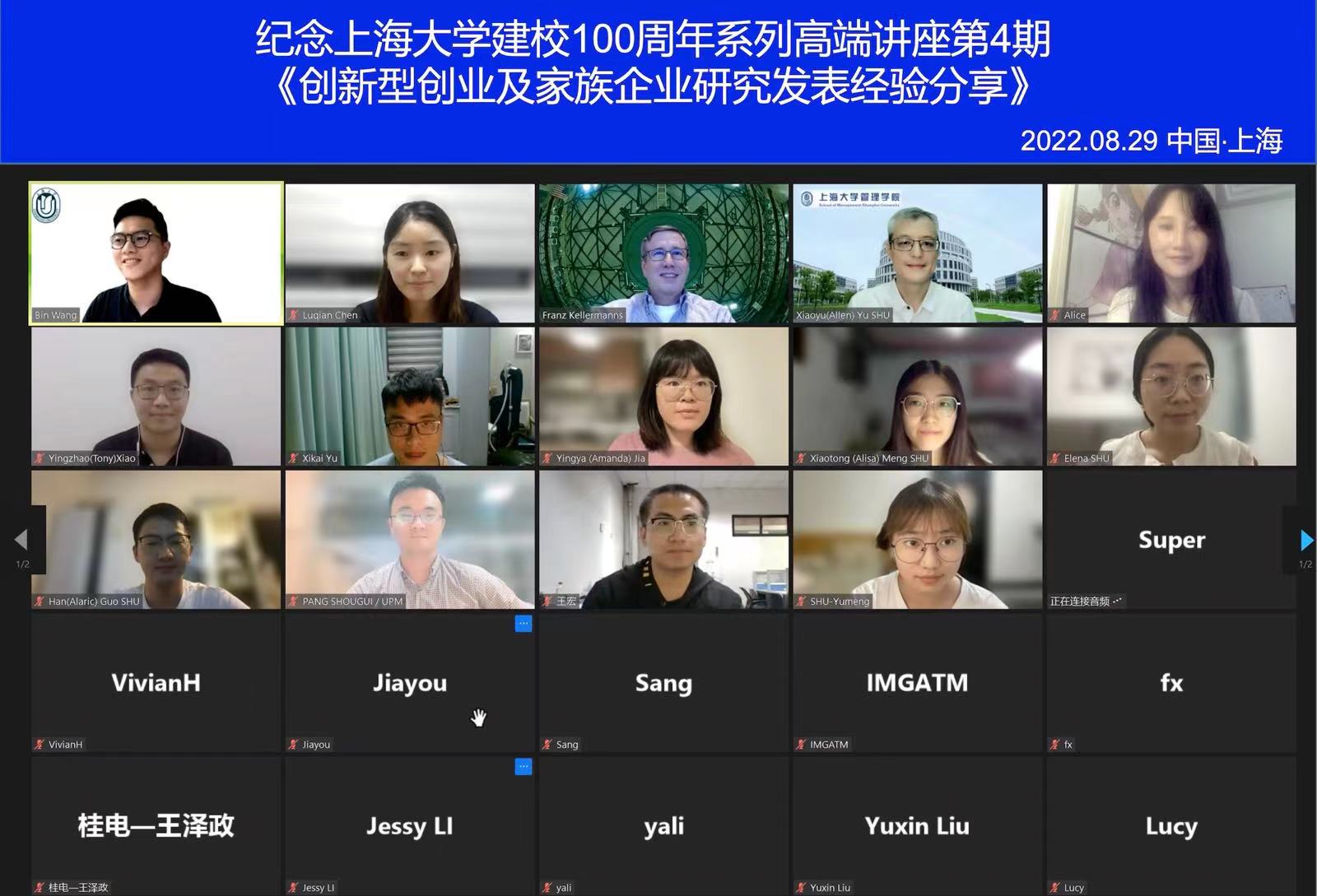 讲座尾声,厦门大学管理学院刘斌助理教授、ac米兰官网中文网站王斌副教授等围绕心理所有权与组织公民行为研究、如何应对论文发表过程中的负面反馈等问题与Franz W. Kellermanns教授进行了深入探讨。本次讲座向与会者分享了创新型创业与家族企业的前沿研究,为创新创业领域的研究学者开拓了新思路,同时对学者未来撰写和发表高质量研究亦有重要启发。讲座最后,Franz W. Kellermanns教授与全体参会者视频合影,纪念ac米兰官网中文网站建校100周年系列高端讲座第4期顺利举办。
