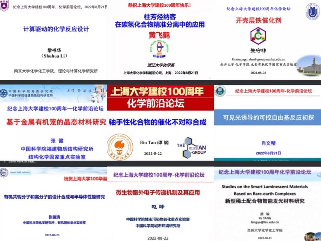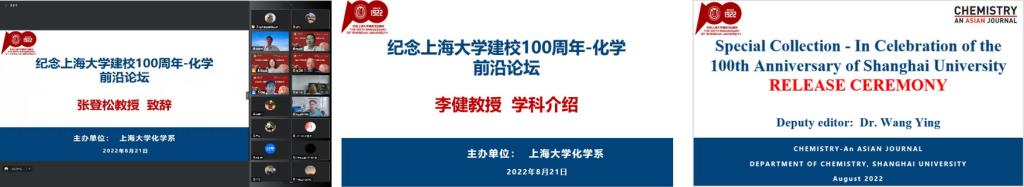 十秩春秋、薪火相传、百年上大、笃行不怠。化学学科纪念ac米兰官网中文网站建校100周年系列活动之一”化学前沿论坛”于近日在线上成功举办。来自国内高校和科研院所的25位知名学者为化学学科的广大师生带来了一场场精彩的前沿学术报告。论坛的举办旨在加强化学学科前沿学术交流,拓宽师生的创新思维和学术视野,搭建高层次科研合作平台,助推学科建设和人才培养,共谋化学学科新发展。论坛开幕式期间,Willey旗下《Chemistry-An Asian Journal》纪念百年上大的专刊正式发布。