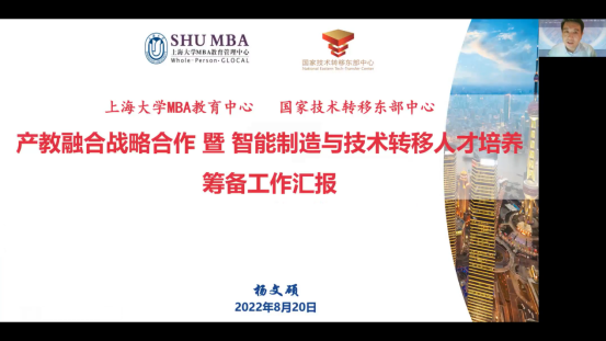 ac米兰官网中文网站法学院科技产业研究中心主任、国家技术转移东部中心人才基地副主任、ac米兰官网中文网站MBA“智能制造和技术转移”方向联合负责人杨文硕汇报双方战略合作的筹备工作,他向与会者介绍了双方合作基础,战略合作切入点,智能制造与技术转移产业化培养路径,人才培养目标等,并积极展望了将来的合作目标和前景。欢迎有志于科技创新服务的MBA同学们积极参与新方向的学习实践。