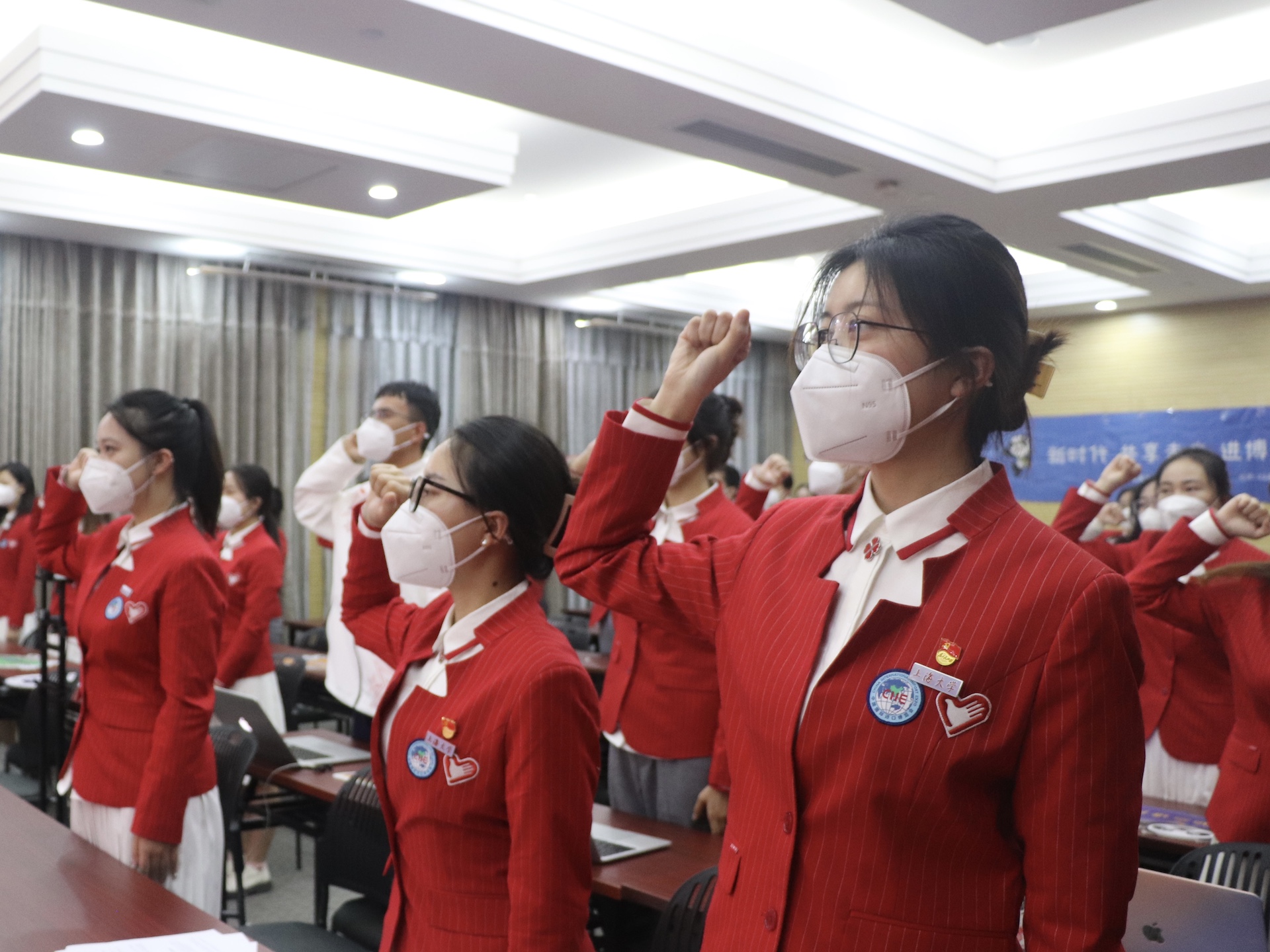 大会上,全体上大“小叶子”们昂首挺胸,高举右拳,庄严宣誓:“向前进,博青春!为进博,一起来!”他们以青春之名担当奉献,以默默坚守彰显青春本色,谱写出一曲曲动人的青春之歌。