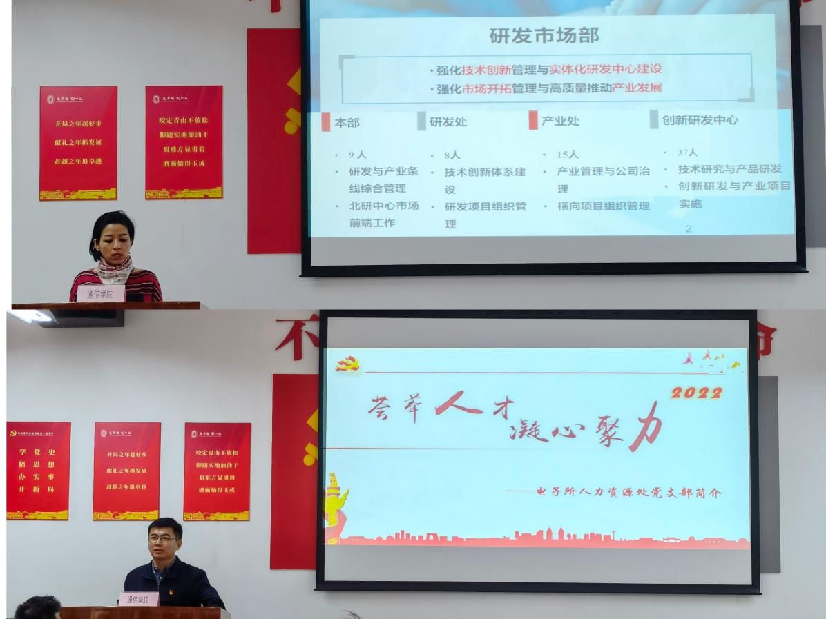 随后,上海航天804所产业处副处长、研发市场部党支部书记张喆,人力资源处副处长、人力资源处党支部书记荀找分别详细介绍了804所研发市场部和人力资源处党支部的具体情况及核心专业技术,使党员们对其有了更深入的了解。