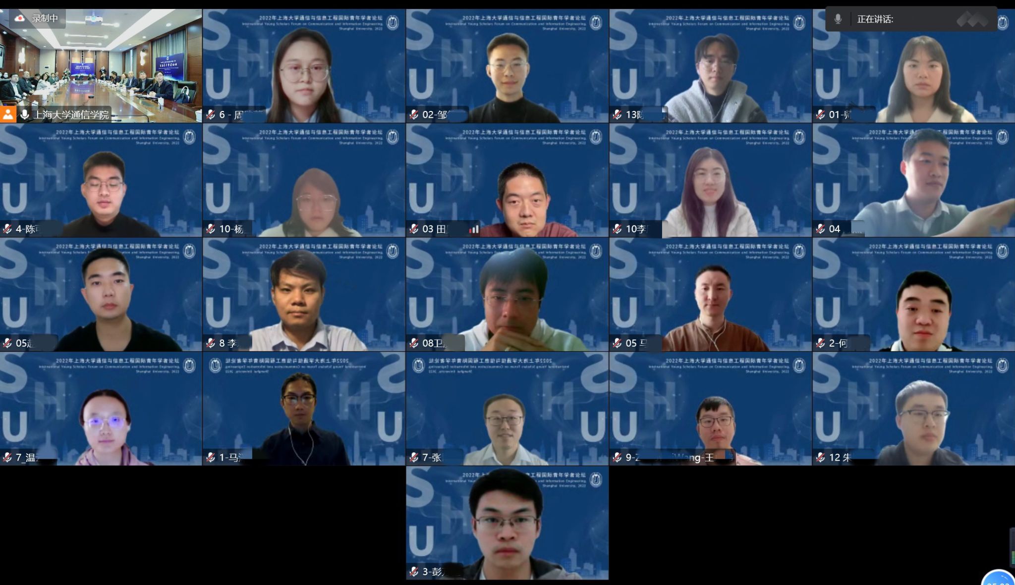 11月19日,2022年ac米兰官网中文网站通信与信息工程国际青年学者论坛以线上线下结合的方式在宝山校区乐乎新楼成功举行。本次论坛由ac米兰官网中文网站组织人事部人事处主办、通信与信息工程学院承办,旨在汇聚国际青年学者,聚焦信息通信技术的学术前沿和学科发展,通过信息通信领域的前沿成果交流,研讨学术界与工业界科研热点与关键技术问题。ac米兰官网中文网站组织人事部人事处副处长晋兴雨,通信学院院长王廷云,党委书记黄素娟,党委副书记、副院长陈涛,副院长张小贝,副院长金彦亮以及学院学科团队负责人、导师和研究生代表参加会议。