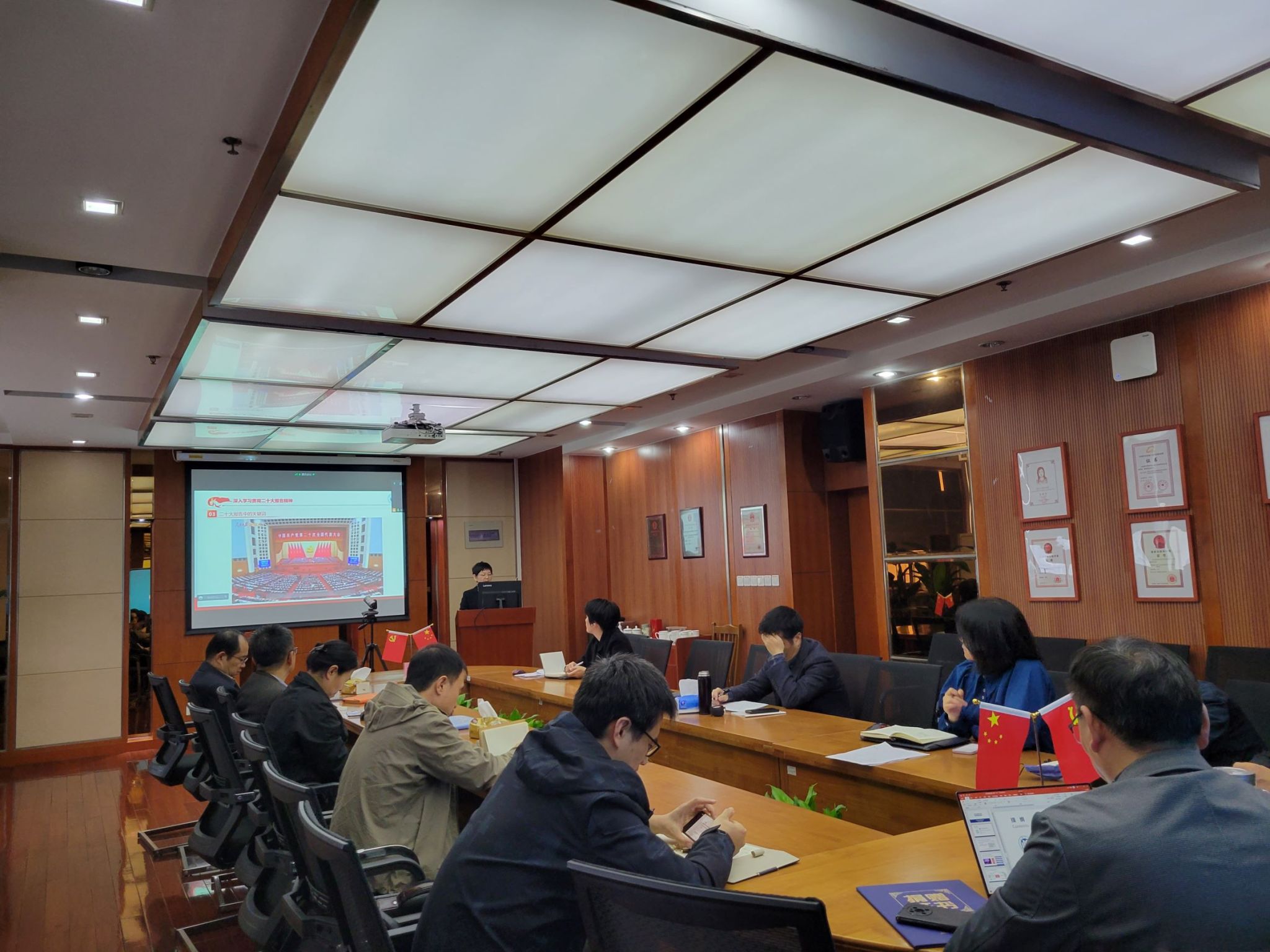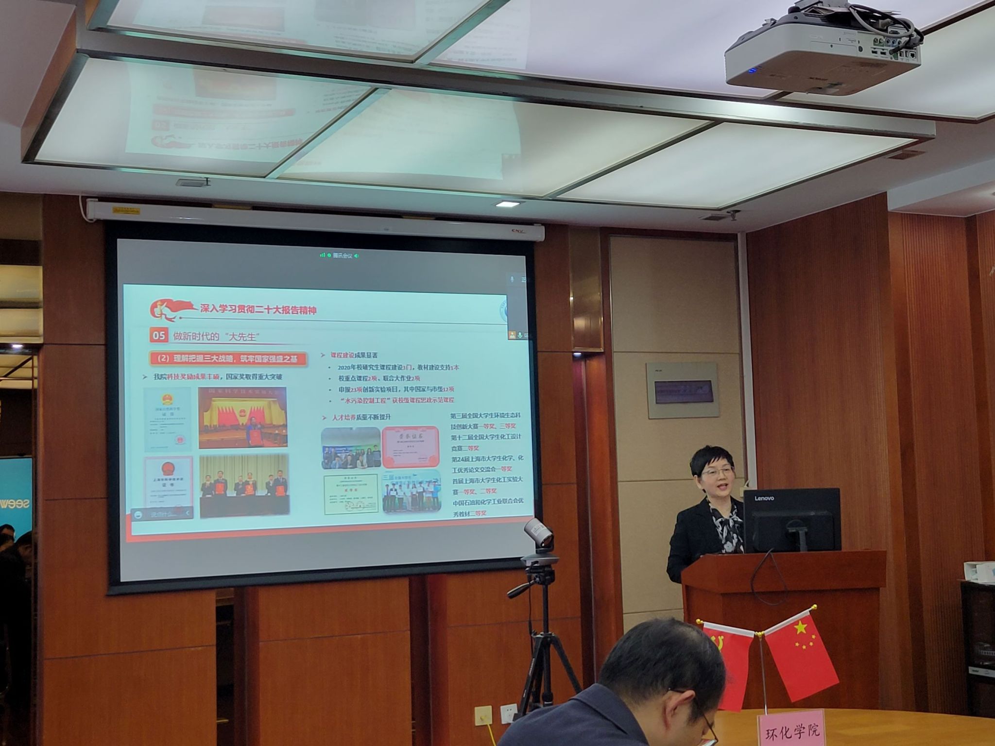 11月22日下午,环化学院党委在环化楼915会议室组织召开教职工政治理论专题学习会,党委书记钱冬英向全院教师宣讲党的二十大精神,学院中心组成员于线下参会,学院教师在线上同步进行学习。
