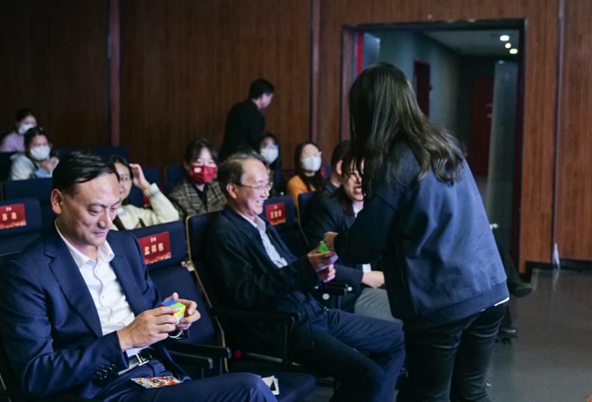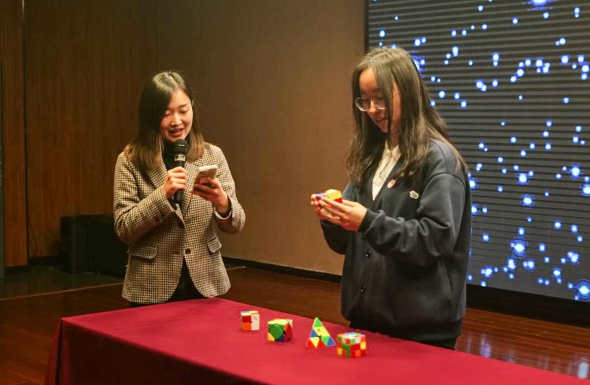本届“大钟奖学金”获得者、2021级新闻学专业本科生徐珍怡带来了互动式魔方表演。徐珍怡邀请了五位老师随机打乱五个魔方,并在短短58秒的时间内顺利将五个魔方还原。徐珍怡精彩的魔方表演赢得了满堂喝彩。
