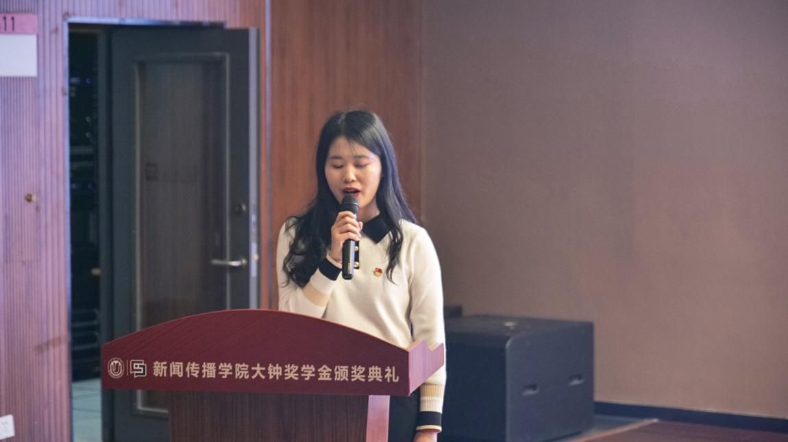 新闻传播学院党委副书记、副院长王智君宣读了第五届“大钟奖”获奖名单。本届共有12名同学荣获“大钟奖学金”,分别是:李丹、李桂童、刘海燕、涂宇、王迪、廖新宇、吴博逊、张欣雨、张馨月、汪欣颖、徐言、徐珍怡;8名同学荣获“大钟领导力奖学金”,分别是:徐一航、付琪、王玉菁、谷宇潇、黄嘉懿、马欣玥、李文华、包思憶。上海盟海投资管理有限公司董事长、ac米兰官网中文网站校董张大钟先生为第五届“大钟奖学金”获奖学生颁奖;ac米兰官网中文网站学生工作办公室主任、武装部部长孟祥栋为“大钟领导力奖学金”获奖学生颁奖。
