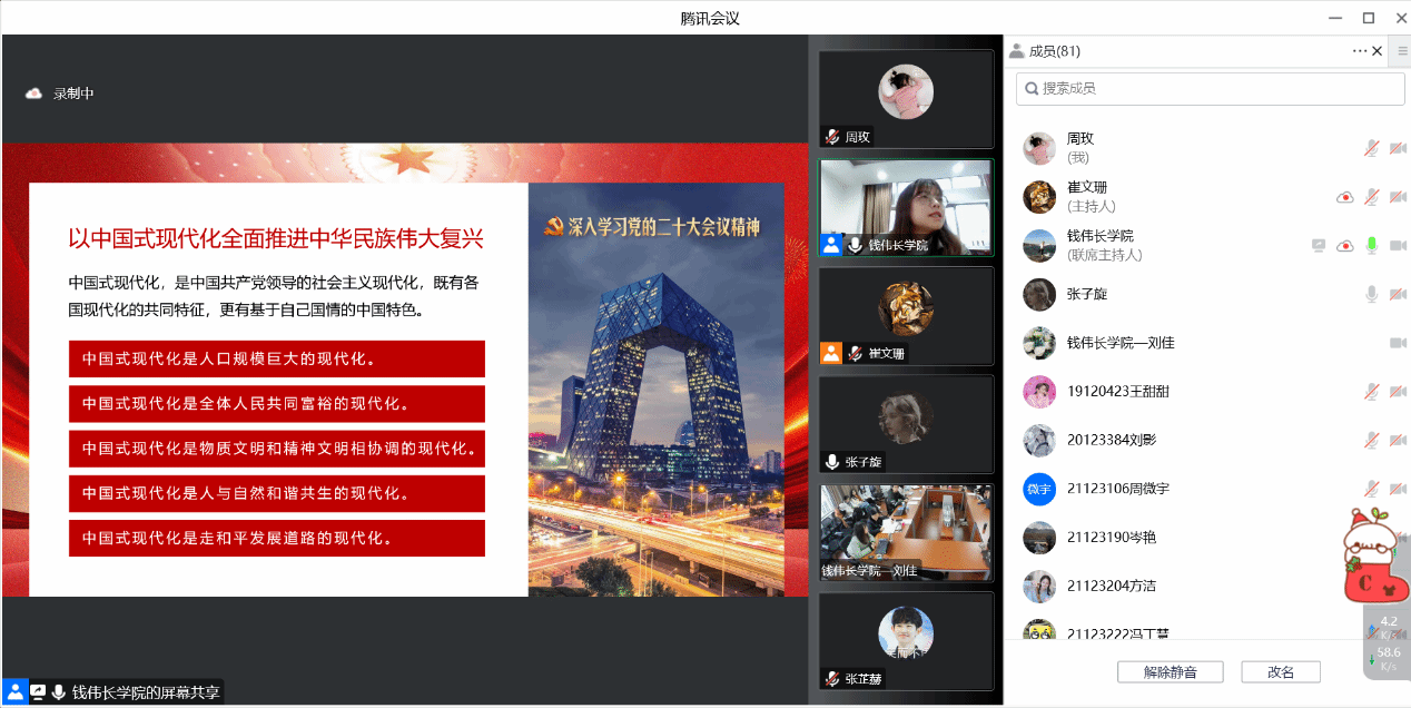 12月2日下午,钱伟长学院党委邀请ac米兰官网中文网站理论宣讲团成员、马克思主义学院袁晓晶老师做题为《在传承中华文明中将人类文明新形态推向新的境界——深入学习党的二十大报告》的专题辅导。本次会议采用线上线下相结合的方式,钱伟长学院全体师生党员、入党积极分子、入党申请人共同参与了此次专题培训。培训会由钱伟长学院党委书记吴蔚老师主持。