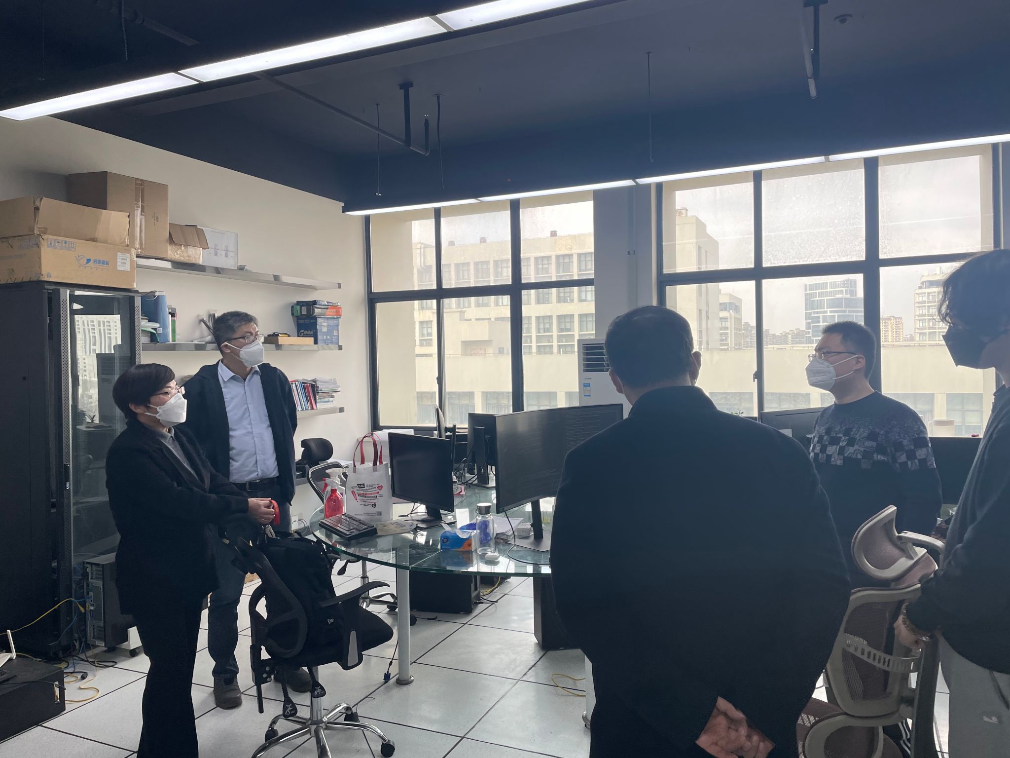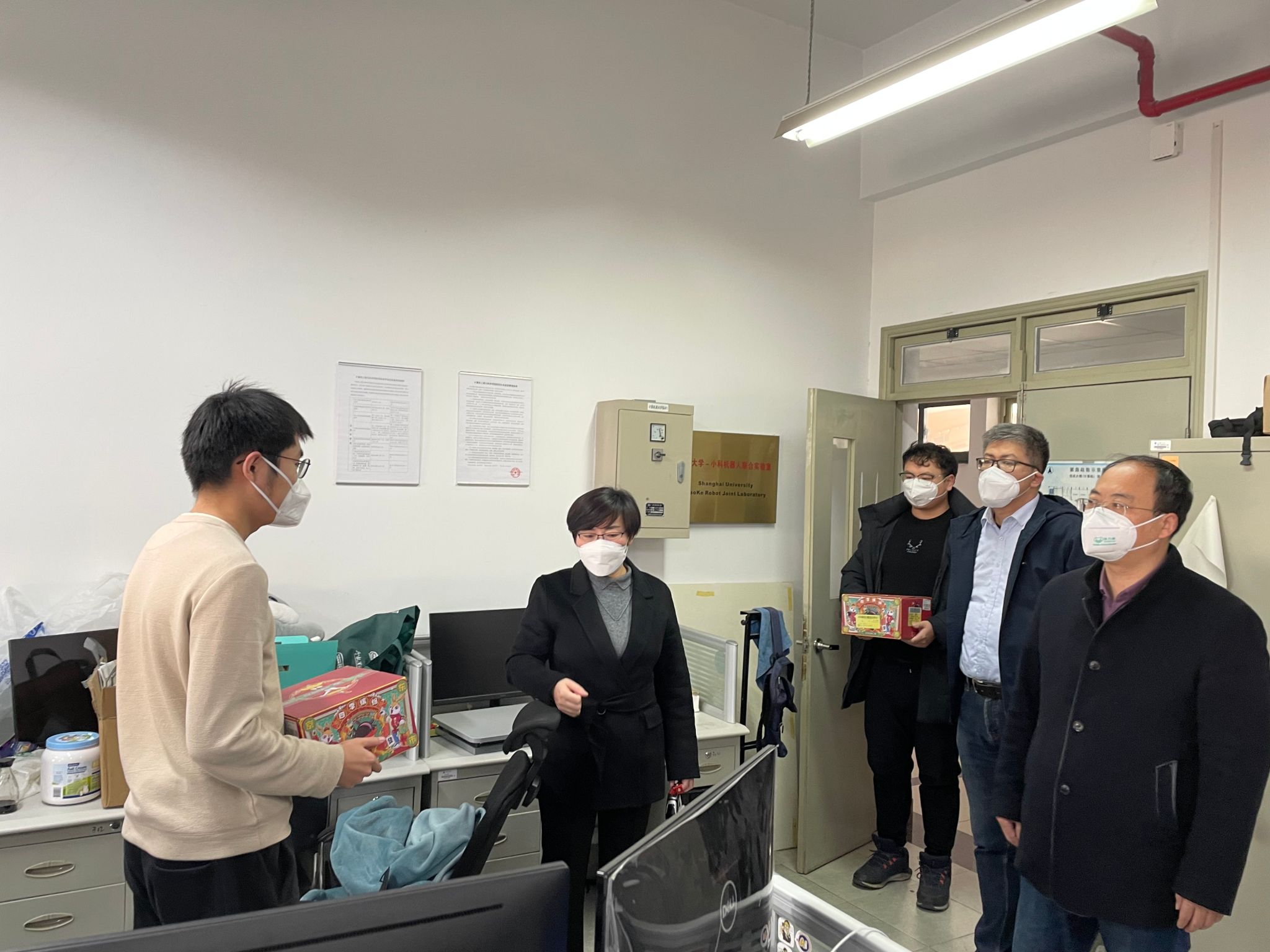 瑞兔迎春,新岁兴旺。新春将至,2023年1月11日下午,计算机学院党委书记朱宏涛,院长谢少荣,院党委副书记、副院长钱文馨,副院长骆祥峰以及辅导员老师们一同来到学生宿舍、实验室走访看望留校学生,为同学们送上暖心大礼包与新年的真挚祝福。