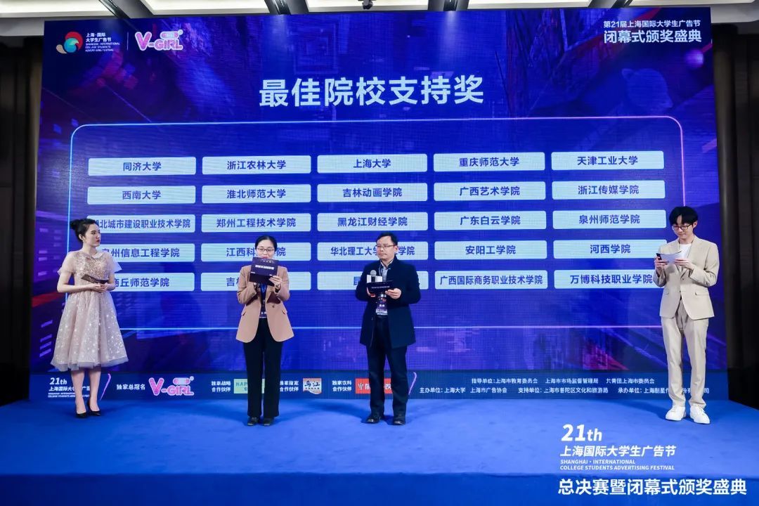 本届大广节由上海市教育委员会、上海市市场监督管理局、共青团上海市委员会指导,ac米兰官网中文网站、上海市广告协会主办,上海剧星传媒股份有限公司独家承办,V-GIRL未可独家总冠名,以“上场”为主题,携六大命题号召怀揣广告梦想的青年学子登上创意赛场,将奇思妙想融入令人眼前一亮的作品之中,与所有创意能量同台竞技,赛事共计收到来自国内外四百余所院校的参赛作品万余件。