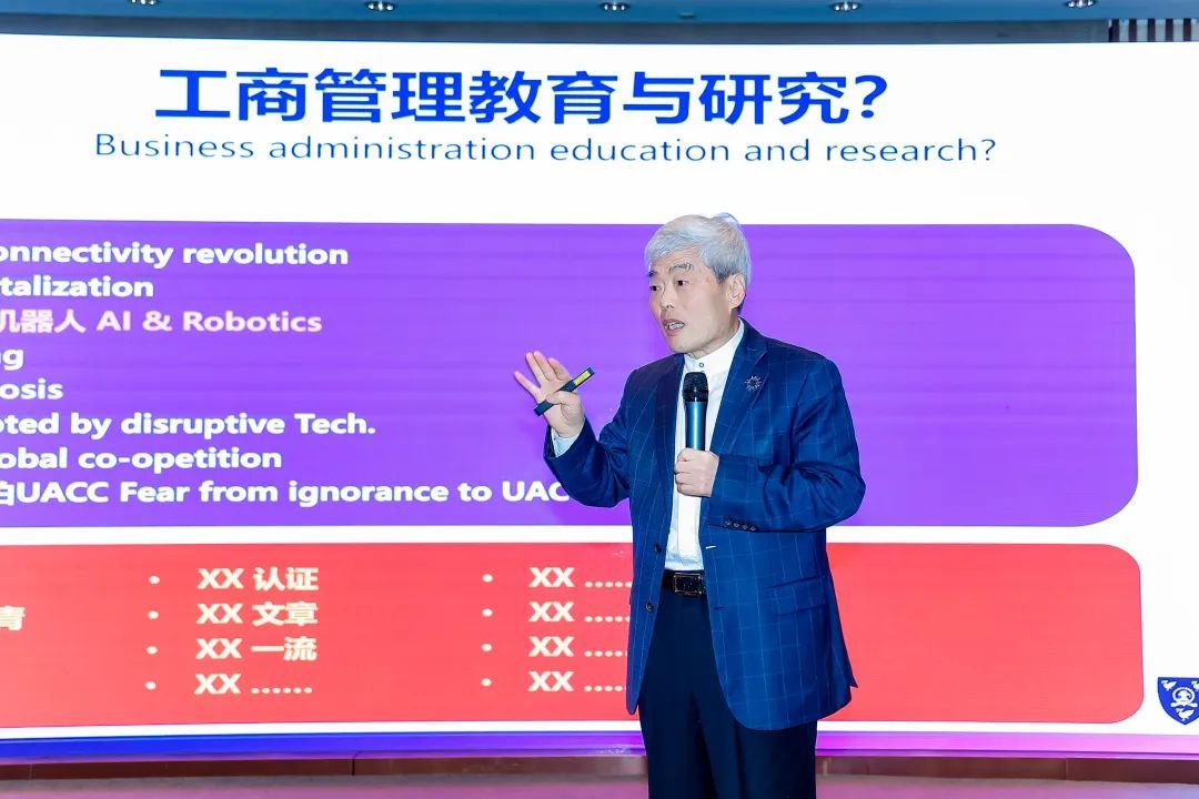 西交利物浦大学执行校长席酉民教授做了题为《数字时代的工商管理》的演讲,他从生态管理、行业融合、产业家养成、心智升级提出了未来的商科教育人才培养模式的思考。他认为,在企业数智化转型的趋势中,未来行业教育一定是行业学院,工商管理专业性人才需求越来越少,行业人才需求增多。我们更需培养的是产业家, 能够利用一个实体或者利用一个关键产业去整合产业要素形成一种生态,通过价值创造让大家享受生态红利。